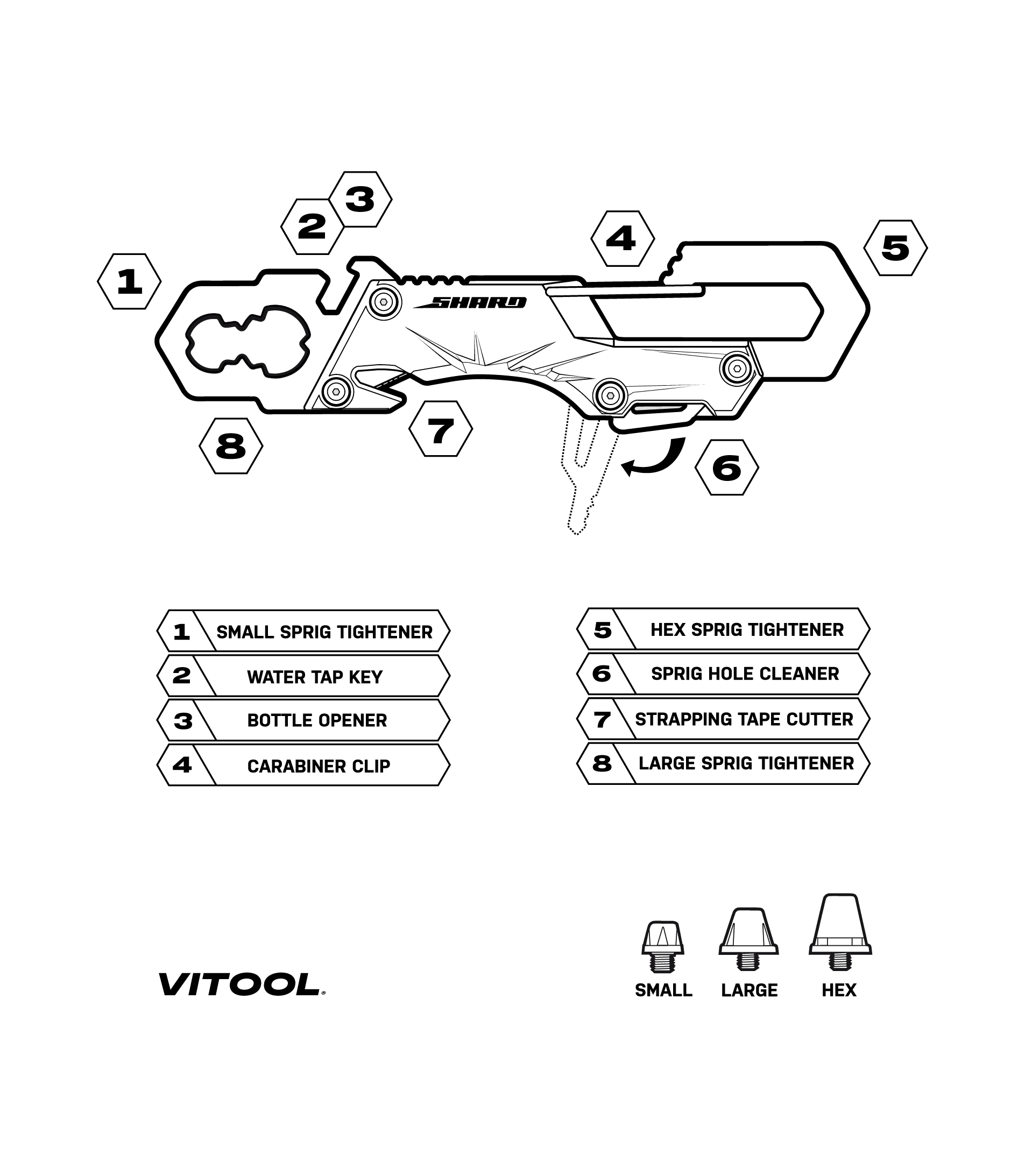 - 3 different sprig wrenches for tightening and loosening studs for generic boot types.